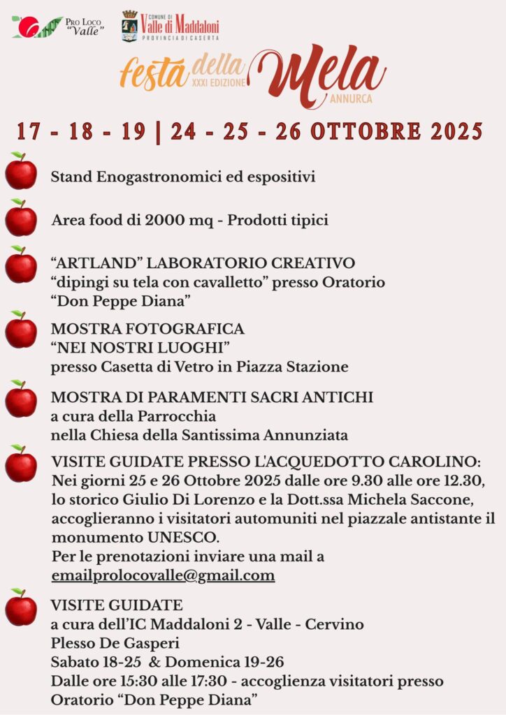 L’autunno nel casertano si veste di profumi, sapori e tradizioni grazie a uno degli eventi più attesi dell’anno: la Festa della Mela Annurca, in programma nei weekend 17-18-19 e 24-25-26 ottobre 2025. Nel suggestivo borgo di Valle di Maddaloni, incastonato tra colline e storia e impreziosito dall’Acquedotto Carolino progettato da Vanvitelli, la comunità locale accoglierà visitatori provenienti da tutta la Campania per celebrare la “Regina delle Mele”.