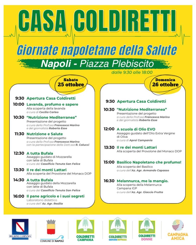 La salute passa anche attraverso la tavola. È questo il messaggio che animerà Casa Coldiretti al Villaggio della Salute in Piazza del Plebiscito a Napoli, in occasione di “Salute per tutti – Le Giornate Napoletane della Salute, Prevenzione e Benessere”, l’iniziativa promossa dal Comune di Napoli in programma venerdì 25 e sabato 26 ottobre.