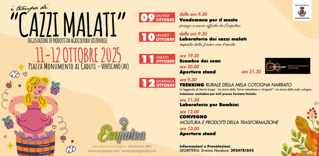 Ha preso ufficialmente il via questa mattina, tra filari d’uva e profumi d’autunno, la quarta edizione di “È tempo di cazzi malati”, la manifestazione organizzata dall’associazione Ecopotea. Un evento che, tra oggi e domenica 12 ottobre, unisce la comunità della Valle del Calore intorno a uno dei dolci più caratteristici e curiosi del territorio: i “cazzi malati”, specialità a base di mosto legata alla tradizione della vendemmia.
