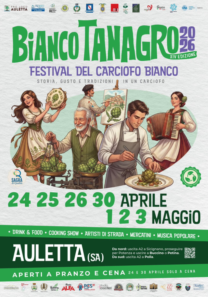 È tutto pronto per la XIV edizione di “Bianco Tanagro”, l’atteso evento dedicato al celebre carciofo bianco della Valle del Tanagro. La manifestazione animerà il centro storico di Auletta (SA) in due fine settimana: dal 24 al 26 aprile e dal 30 aprile al 3 maggio 2026.