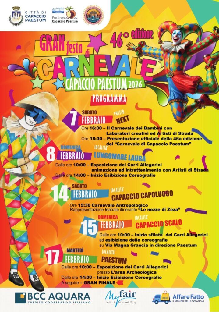 Tutto pronto per l’edizione 2026 del Carnevale di Capaccio Paestum, uno degli appuntamenti più attesi della provincia di Salerno. I carri allegorici sono pronti a sfilare per le strade della cittadina, trasformandola in un’esplosione di colori, musica e allegria.