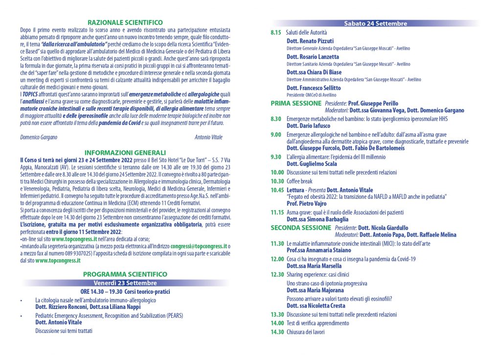 Settembre 23, 2022Come prevenire, diagnosticare e gestire le emergenze metaboliche e allergologiche, con un focus sulle malattie infiammatorie croniche intestinali e le allergie alimentari: sono alcuni degli argomenti che saranno trattati nel corso del Secondo incontro di Immunoallergologia, la due giorni di confronto tra esperti, organizzata anche quest’anno da Domenico Gargano e Antonio Vitale, rispettivamente Responsabile dell’Unità operativa di Allergologia e Immunologia Clinica e Direttore dell’Unità operativa di Pediatria dell’Azienda ospedaliera “San Giuseppe Moscati” di Avellino.
