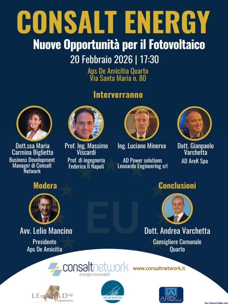 Si terrà giovedì 20 febbraio 2026 alle ore 17:30, presso la sede di APS De Amicitia in via Santa Maria 80, il convegno “Consalt Energy – Nuove Opportunità per il Fotovoltaico”, promosso da Consalt Network – Energie Rinnovabili, con il coinvolgimento di professionisti, imprese e rappresentanti istituzionali del settore energetico.
