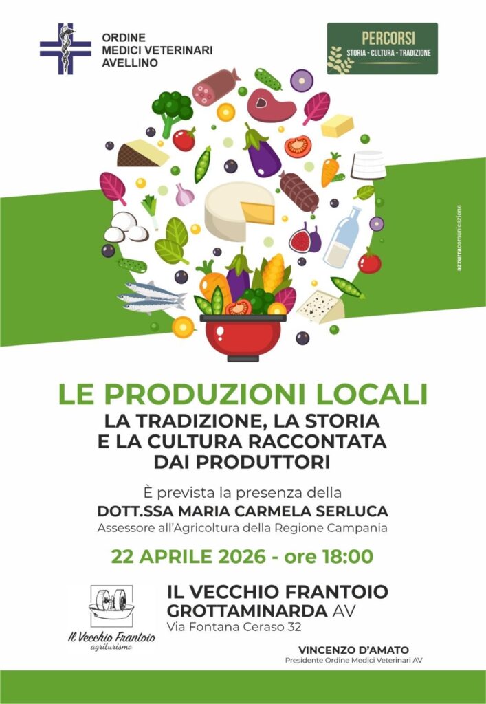 Aprile 23, 2026Nell’ambito di “Percorsi Storia – Cultura – Tradizione”, promosso dall’Ordine dei Medici Veterinari della Provincia di Avellino, si è svolto a Grottaminarda, nelle sale dell’Azienda Agricola “Il Vecchio Frantoio”, il convegno dal titolo “Le produzioni locali, la tradizione, la storia e la cultura raccontata dai produttori”.