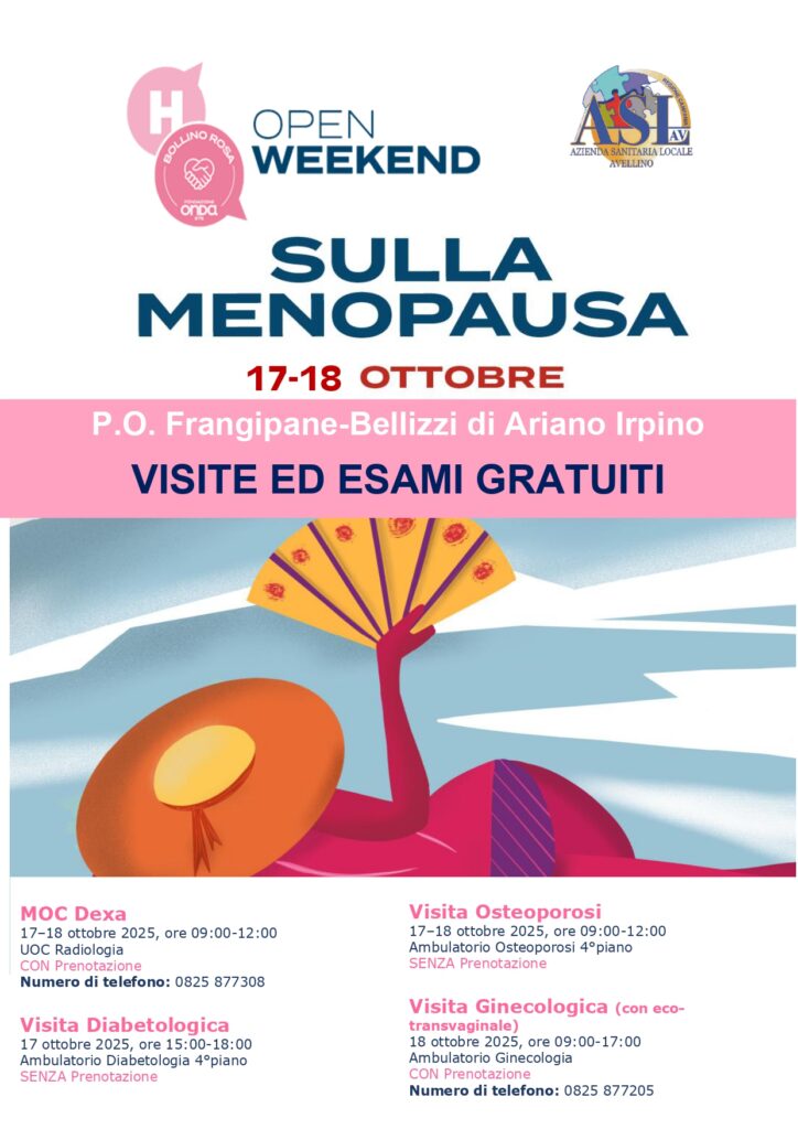 Un weekend interamente dedicato alla salute delle donne in menopausa. Il 17 e 18 ottobre 2025 l’Ospedale “Frangipane-Bellizzi” di Ariano Irpino, struttura insignita del Bollino Rosa per l’attenzione alla salute femminile, apre le porte con l’(H) Open Weekend sulla Menopausa, offrendo visite specialistiche ed esami gratuiti a tutte le donne che affrontano questa delicata fase della vita.