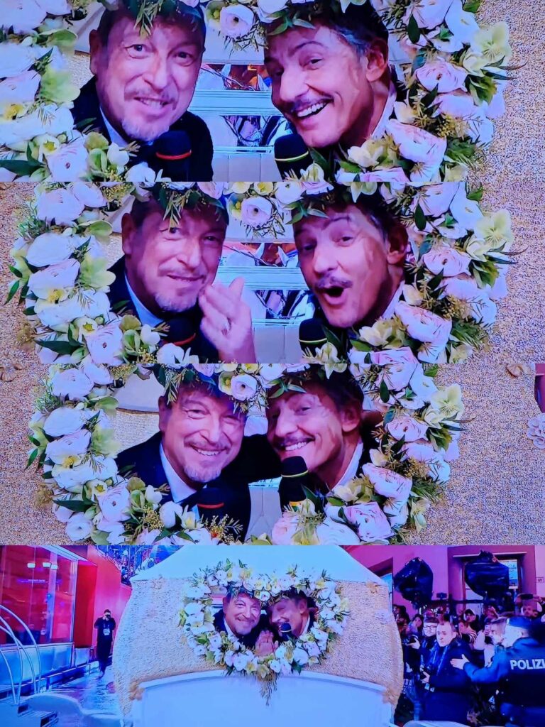 Il direttore artistico e lo showman, coconduttore nella serata finale di Sanremo 2024, alla fine della kermesse escono di scena lasciando il teatro Ariston mano nella mano. Quindi, sulle note di I sogni sono desideri, salgono su una carrozza bianca e salutano: “Ciao, Sanremo. Grazie di tutto”