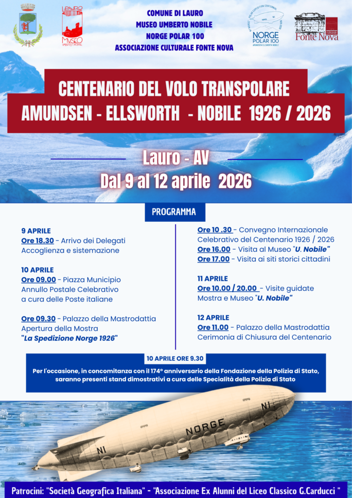 Un ricco programma di iniziative tra memoria, istituzioni e valorizzazione del territorio: la città di Lauro si prepara a celebrare, dal 9 al 12 aprile, due importanti ricorrenze, il Centenario della spedizione del Dirigibile Norge e il 174° anniversario della Fondazione della Polizia di Stato.