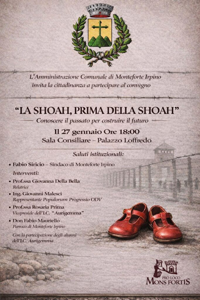 Protagonisti dell’iniziativa saranno anche gli studenti dell’Istituto Comprensivo “Aurigemma” di Monteforte Irpino, coinvolti non come attori, ma come voci chiamate a restituire dignità a chi è stato cancellato. I ragazzi daranno lettura di testi e poesie, in un dialogo tra memoria e futuro che passa attraverso la scuola. All’evento prenderà parte anche la Pro Loco, a testimonianza di una comunità che si riconosce nel valore condiviso del ricordo.
