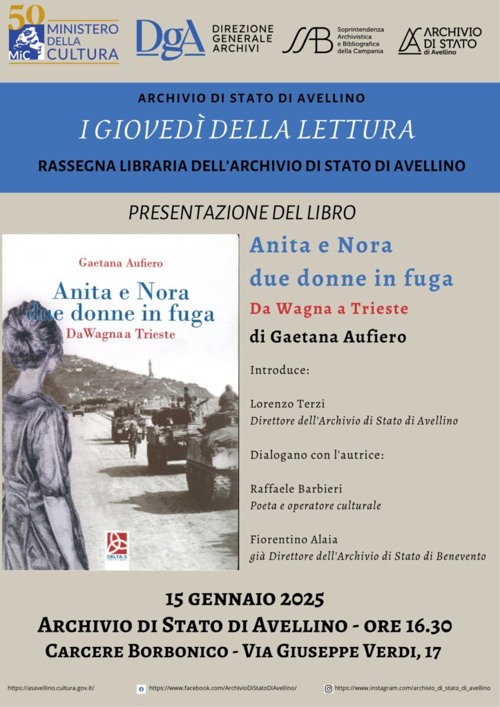 Nuovo incontro con la rassegna culturale “I giovedì della lettura” promossa dall’Archivio di Stato di Avellino. Giovedì 15 gennaio, alle ore 16:30, sarà presentato il romanzo Anita e Nora. Due donne in fuga. Da Wagna a Trieste di Gaetana Aufiero.