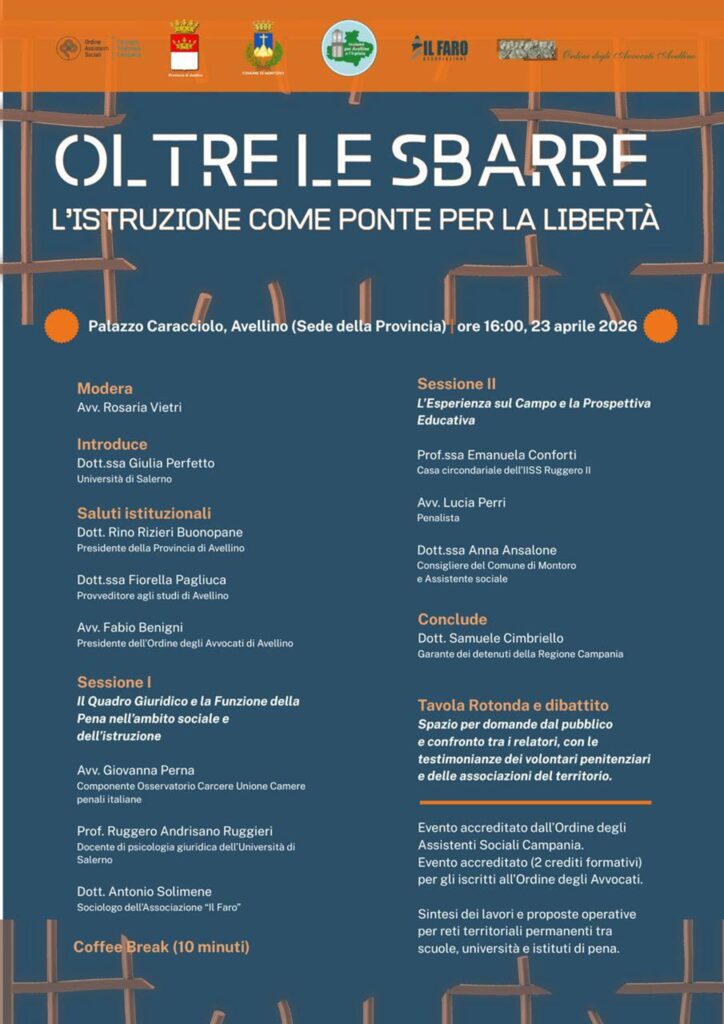 Il 23 aprile 2026, presso il Palazzo Caracciolo di Avellino, sede della Provincia, si terrà il convegno “Oltre le Sbarre: l’Istruzione come Ponte per la Libertà”, un importante momento di riflessione su un tema di grande rilevanza sociale ed educativa: il ruolo dell’istruzione nei percorsi di inclusione e reinserimento, anche nei contesti penitenziari.