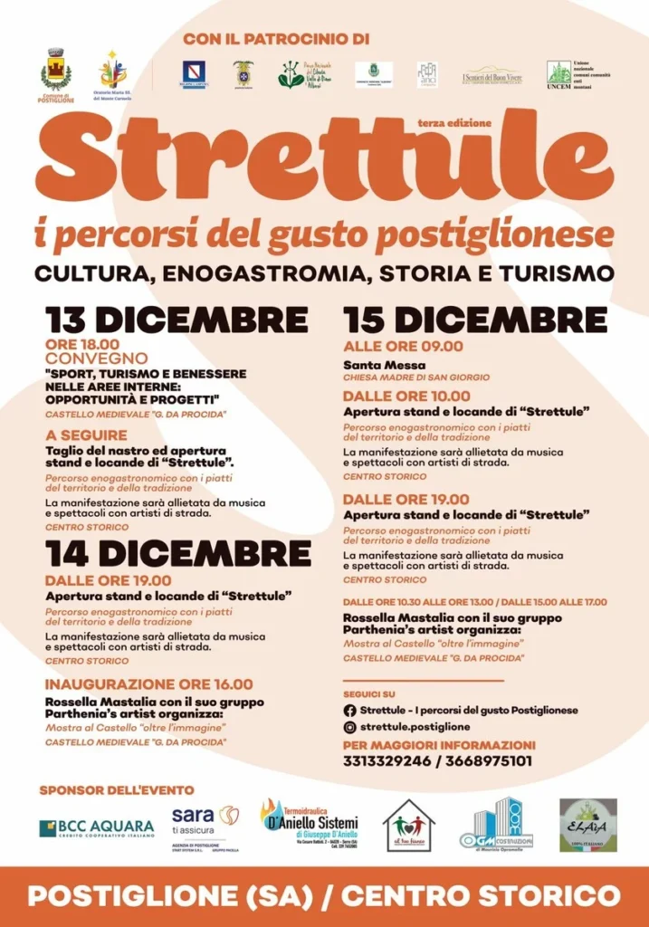 Il centro storico di Postiglione è pronto a trasformarsi, dal 13 al 15 dicembre, in un percorso diffuso di gusto e tradizione per la terza edizione di “Strettule – I percorsi del gusto postiglionese”, l’evento enogastronomico, turistico e culturale che richiama ogni anno migliaia di visitatori.