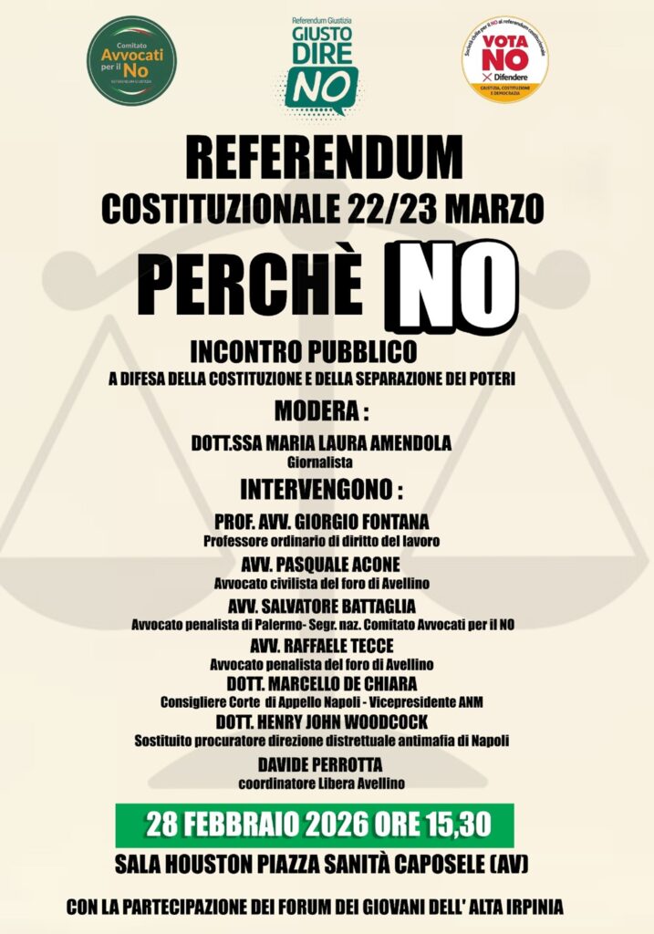 In vista del referendum costituzionale in programma il 22 e 23 marzo, il dibattito pubblico entra nel vivo anche in Irpinia. Sabato 28 febbraio, alle ore 15.30, presso la Sala Houston in Piazza Sanità a Caposele (AV), si terrà l’incontro dal titolo “Perché NO”, promosso dai comitati Avvocati per il No, Giusto dire No e Società Civile per il No.