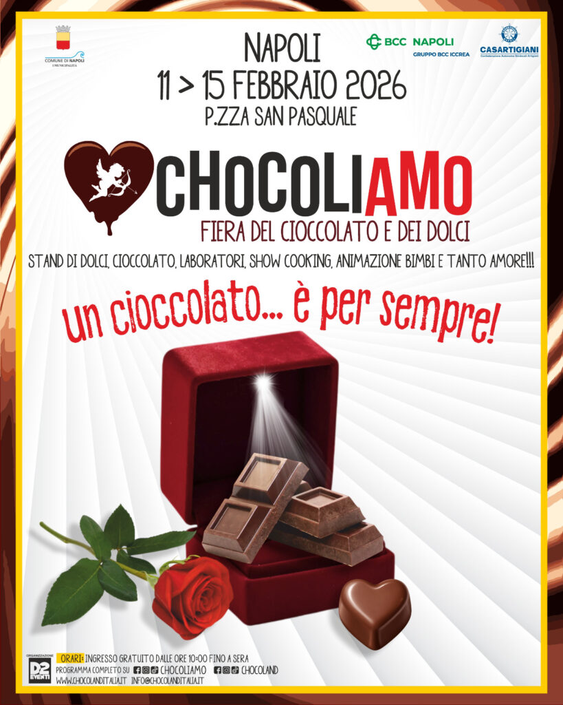 L’iniziativa è organizzata da D2 Eventi in collaborazione con Casartigiani, con il patrocinio della Prima Municipalità di Napoli, presieduta da Giovanna Mazzone, e della Bcc Napoli. Tra le proposte in mostra: cuori di cioccolato, praline, macaron, nudi, churros, pancake, dolci siciliani, liquirizia e caramelle, tutti prodotti realizzati con ingredienti selezionati e cura artigianale.
