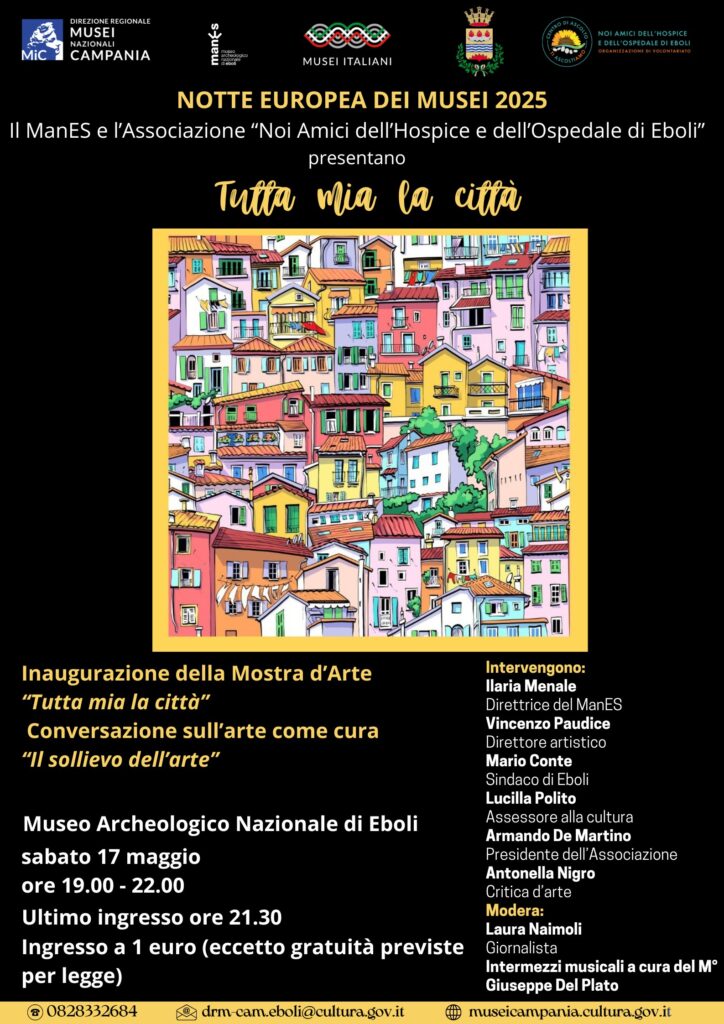 Il cuore pulsante della serata sarà l’inaugurazione della mostra d’arte “Tutta mia la città”, a cura di Vincenzo Paudice, promossa in collaborazione con l’associazione “Noi Amici dell’Hospice e dell’Ospedale di Eboli”. L’esposizione raccoglie le opere nate nell’ambito del progetto omonimo del 2024, che ha coinvolto numerosi artisti nella narrazione visiva dell’identità culturale di Eboli e del suo territorio. Un viaggio collettivo, emozionale e creativo, dove ogni opera diventa frammento di una memoria condivisa.