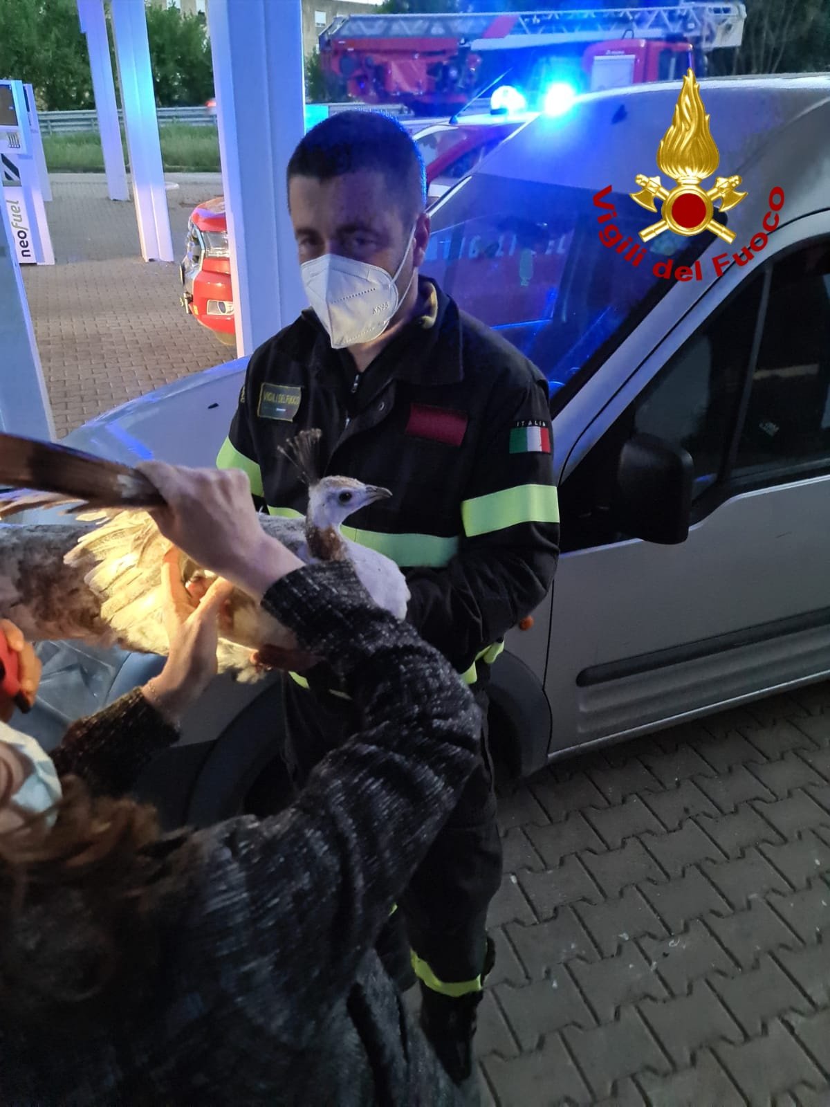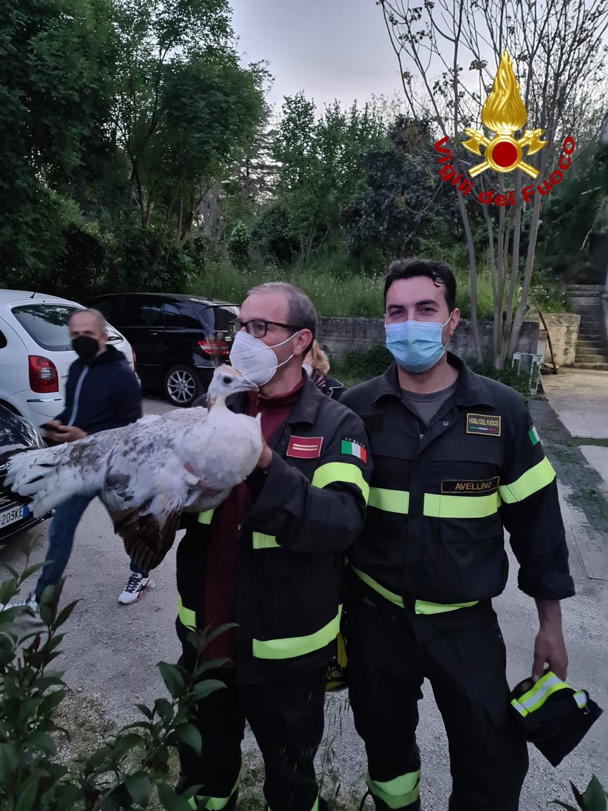 Aprile 29, 2021Intervento curioso quello effettuato da una squadra dei Vigili del Fuoco di Avellino, nel tardo pomeriggio di oggi sulla strada Bonatti, alla periferia della città, per il recupero di un esemplare di pavone femmina su di un albero del posto. Infatti una signora residente avvistato il pennuto ha avvisato la sala operativa del Comando di via Zigarelli, e con non poche difficoltà il pavone è stato recuperato e affidato alla dottoressa del servizio ASL veterinario.